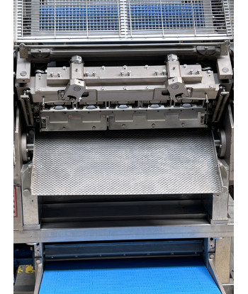 Le processus commence par l'alimentation de la feuille de pâte fraîche, qui peut provenir d'une presse à pâtes ou d'un laminoir automatique. La feuille d'entrée a généralement une épaisseur d'environ 6 millimètres.